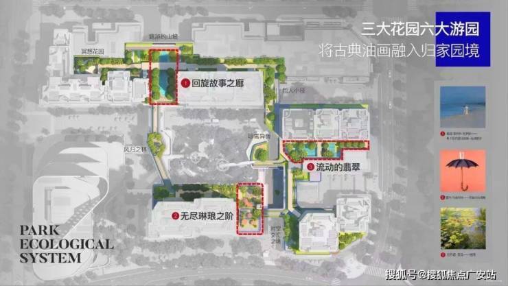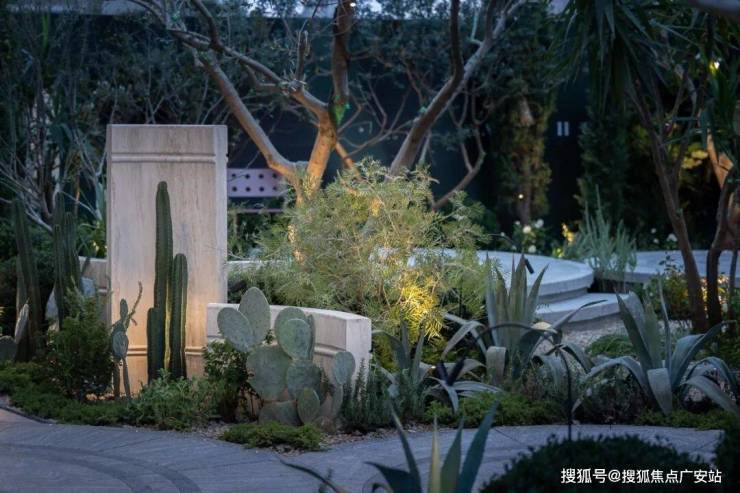 绿宝石花园以莫奈《睡莲》为灵感,打造约30米长的水景花园;林间溪谷则采用椭圆水池设计,汲取克罗耶《斯卡恩的夏日傍晚-海滩散步》的艺术意境,营造水景与休憩空间的交互体验;城市露台位于6号楼下,面向中兴公园,异域植物环绕的阶梯提供从高向低的景观视野,塑造城市与自然的层次感.