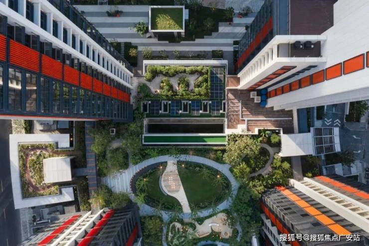 理想之地则为城市构建起“片区级共生系统”.其以6座桥及空中连廊打造『连续慢行系统』,天桥将地块与嘉定新城轨交站点连接,同时地块内设置借鉴高线公园的能量环天桥设计,联通围绕超级十字路口的四个地块,形成以能量环为核心的空中步行体系,增加社区的活力.